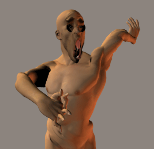 I thought it might be interesting to render a few quick animations of the Nightmare Man starting out in a normal, neutral pose, then gradually being distorted beyond all sense of reality.